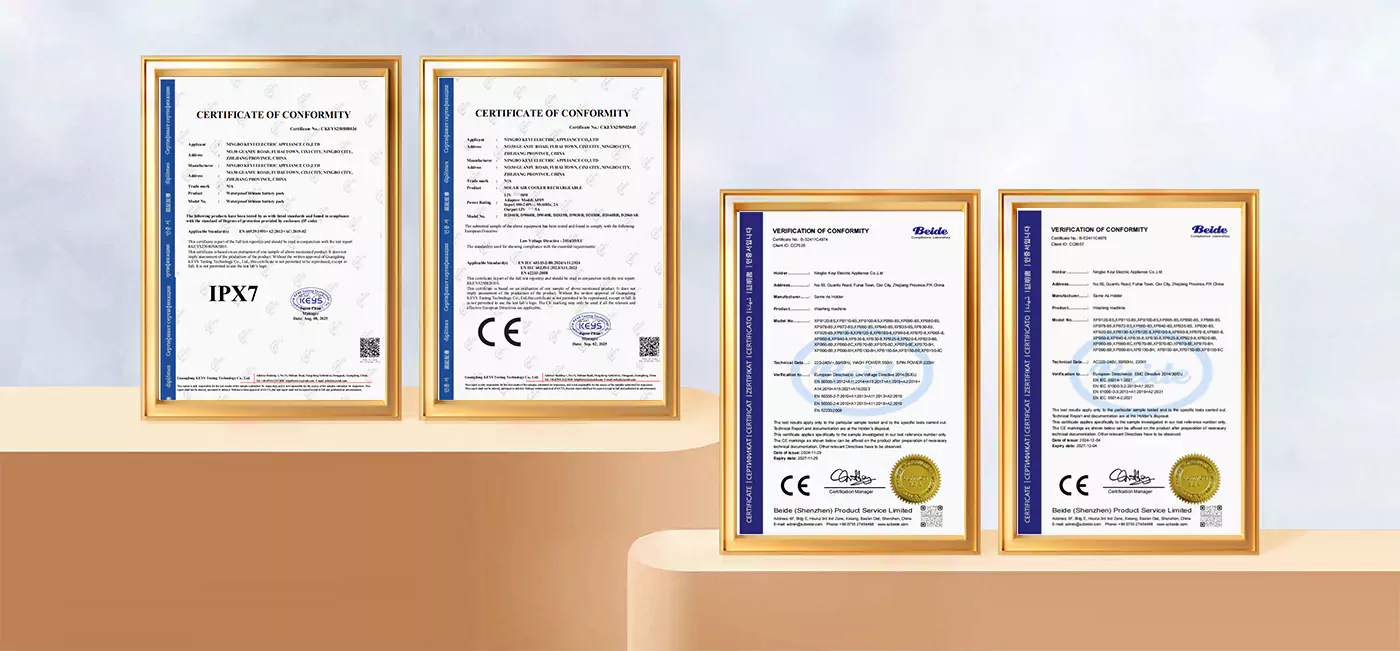 Mūsų skalbimo mašinos ir oro aušintuvai atitiko ES testavimo standartus ir gavo CE sertifikatą. Baterija pasižymi IPX7 atsparumu vandeniui. Taip pat esame sertifikuoti kaip puikus pardavėjas vietinėse elektroninės prekybos platformose ir „Alibaba“.